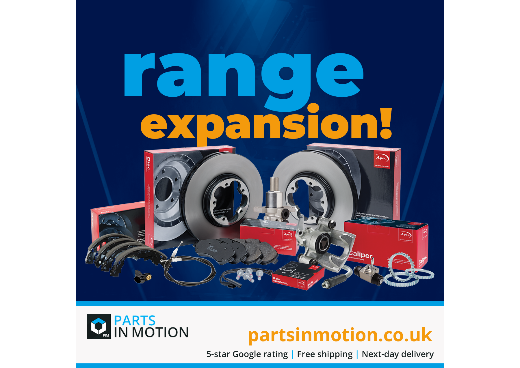 Online distributor, PartsinMotion.co.uk, has expanded its range of Apec’s premium quality range, including brake pads, discs, brake hoses, coil springs, suspension arms and calipers, now offering more than 21,000 part numbers in its ever-growing portfolio.