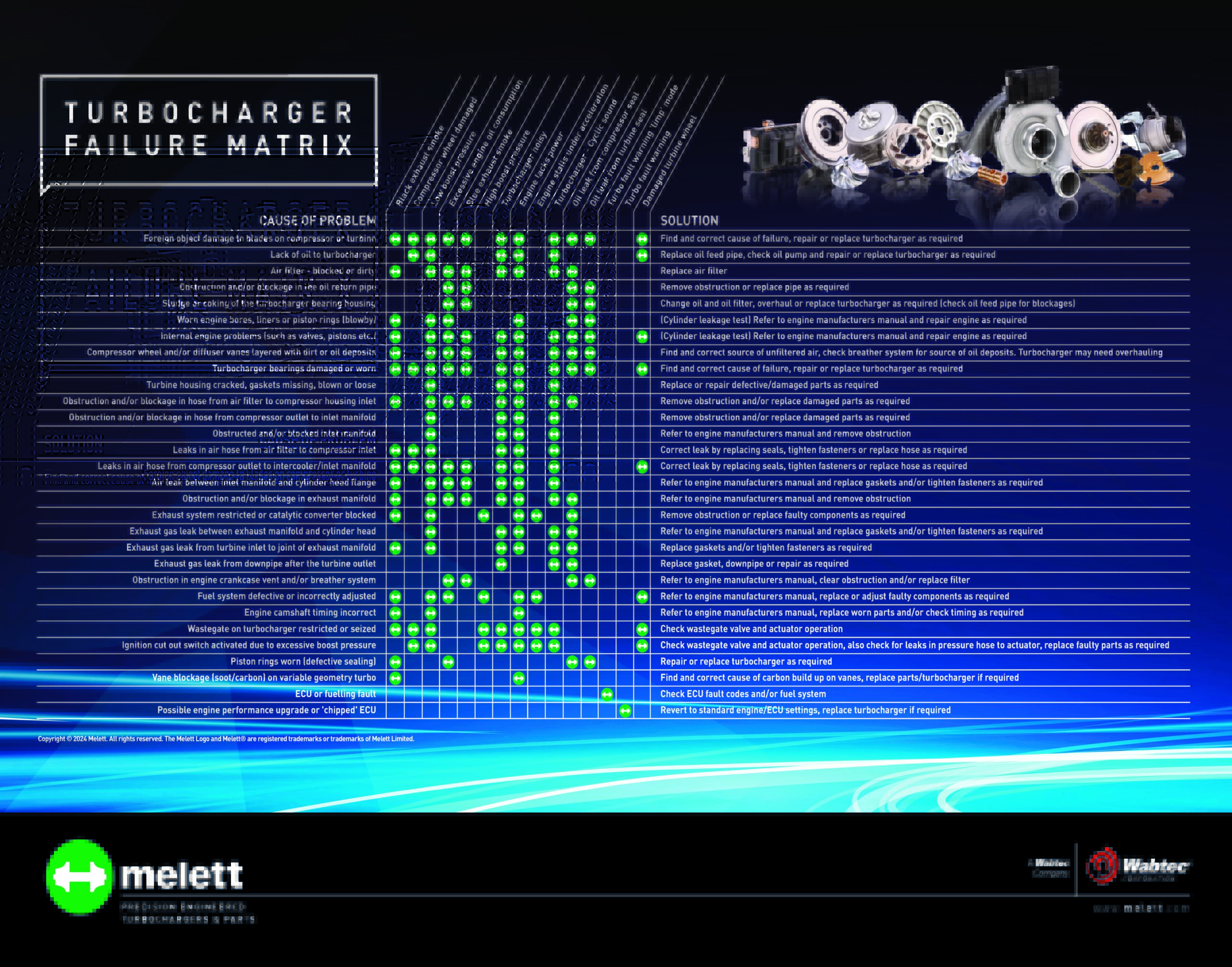 Melett, a leader in precision-engineered turbochargers and components for the global automotive aftermarket, has relaunched its Turbocharger Failure Matrix, designed to offer turbo repairers an easy and comprehensive, point-of-sale poster to demonstrate the most common turbocharger failures.