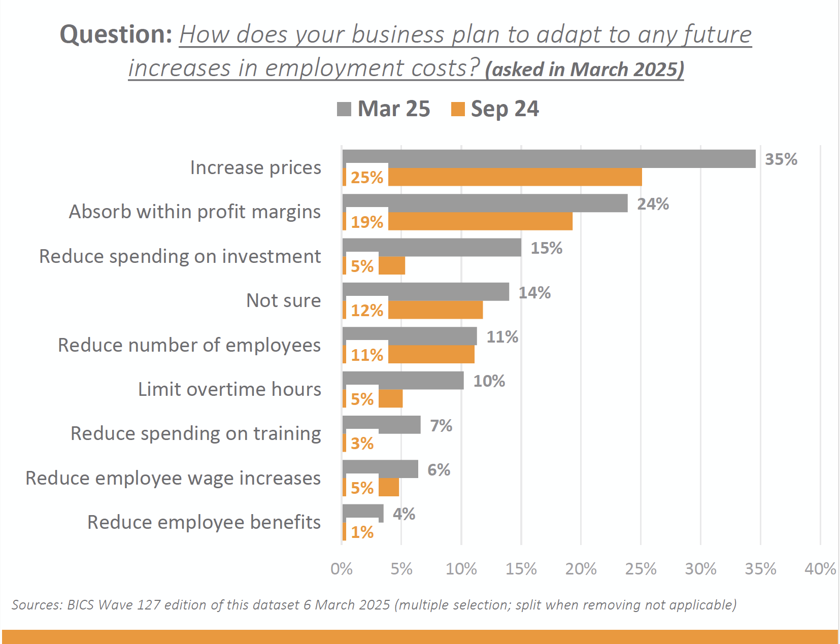In an Office of National Statistics (ONS) survey, companies plan to pass on the increased cost to their customer, with 35% taking this strategy (and it has increased by 10 points since September 2024).