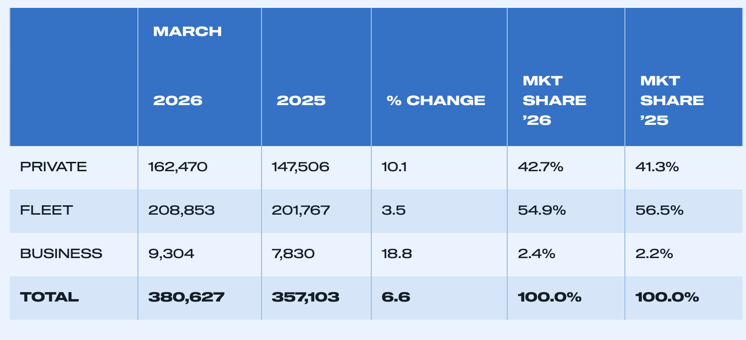 Growth was driven primarily by private demand, with retail registrations rising 10.1% to 162,470 units. Fleet registrations increased 3.5% to 208,853 units, while the smaller business sector grew 18.8% to 9,304 units.