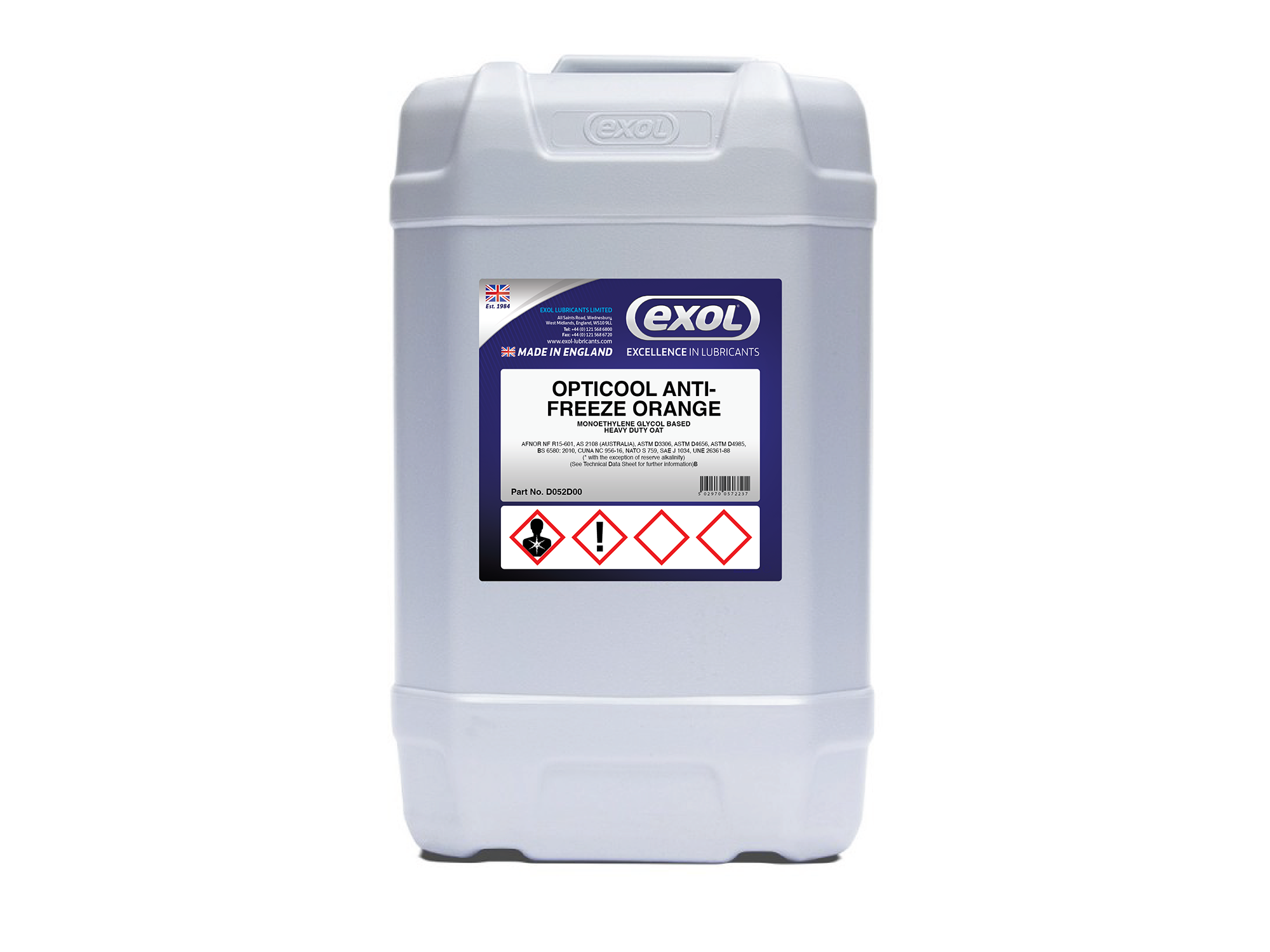 Opticool Antifreeze Orange is suitable for a wide range of heavy-duty and OEM applications, including Caterpillar, John Deere, Jaguar Land Rover, Peugeot, Citroen, Volvo, Perkins, and Massey Ferguson. It also meets or exceeds major global standards.